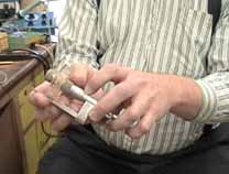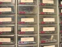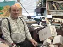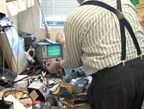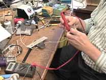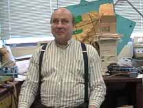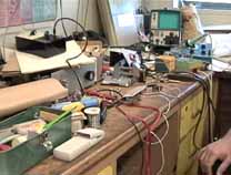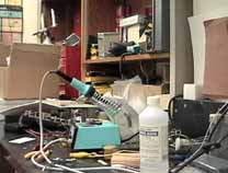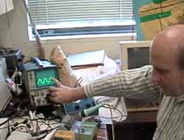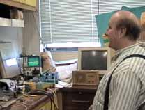 ダウンタウンらしく縦に長い(高い)ビルの1階の受け付けで、エンジニアのWilliam A. Gerrey氏(Bill)に面会の旨を告げ、エレベータで4階に。エレベータを降りると、そこに白杖を持ったBillがにこやかに出迎えてくれました。まずは、Billのオフィスに案内されたのですが、そこは自分の部屋と同じように電子回路の製作ツールやら計測機器、作りかけの回路基板などが転がるエレクトロニクス・エンジニアの部屋です。全盲であっても電子回路の設計はもとより、半田付けまでこなしてしまうスーパーエンジニアです。もちん、事前の訪問の依頼など連絡調整は全て電子メールにて行いました。